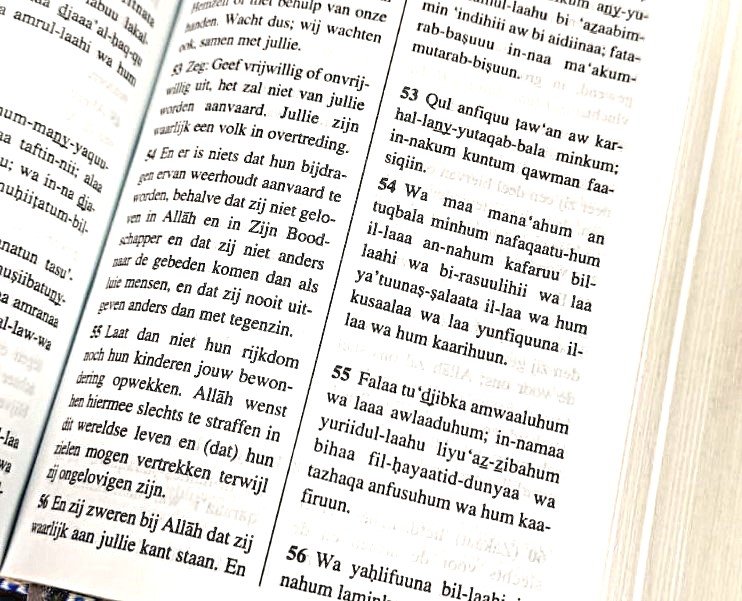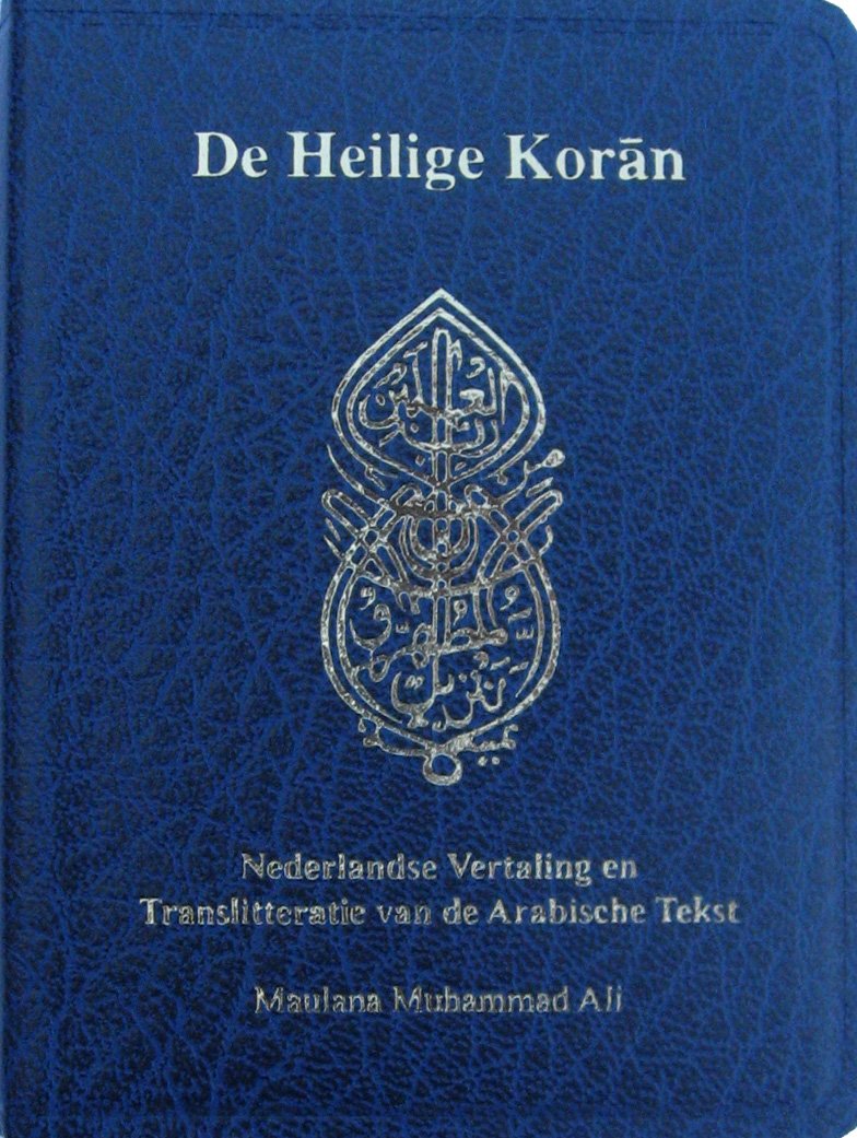 Een pocket-uitgave van de Heilige Koran in het Nederlands met transliteratie van de Arabische tekst in twee kolommen naast elkaar.